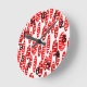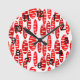 This wall clock has a repeating pattern of ovals in red and brick with scattered white ovals.