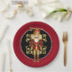Holiday paper plate shown with a festive Christmas nutcracker print. Plate size 9" Plate color Garnet