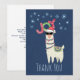 A Christmas holiday gift basket thank you card. Designed with a funny illustration. A cute llama wearing black sunglasses and a red santa hat. Also wearing a South American styled blanket and pom-poms. The word Joy written above his head in a festive colourful font. Blue snowflakes falling down.