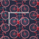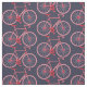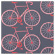 This fabric for Christmas has a repeating pattern of red bicycles with candy cane red and white stripes on the frame.