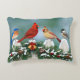 A collection of songbirds on a snow covered fence decorated with Christmas garland. Bird species include eastern bluebird, northern red cardinals, and black-capped chickadee. The fence is adorned with a Christmas garland made of pine branches, cones, and holly berries, accented with gold jingle bells and a bright red ribbon.