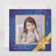 A non-religious holiday card with a blue background speckled with hearts and dots. A gold frame and bow add sparkle and glow.