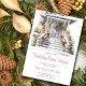 A pretty watercolor Christmas holiday open house party invitation featuring a house in snow decorated for the holidays.