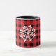 This coffee mug is shown with a black and red buffalo plaid print with a large snowflake.
