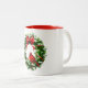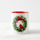 Holiday coffee mug is shown here with a festive christmas wreath and cardinal print.