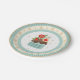 This paper plate features a holiday cupcake with a heart decoration on top. The border around the plate is blue and cream with gold snowflakes and a gold outside edge.