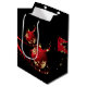Holiday gift bag shown in a festive Christmas red and gold ornaments print.