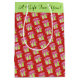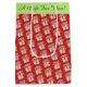 A generic gift bag design that can be customized for any occasion. This design features a pattern of green gift boxes with pink and red bows, on a red background. The coordinating green banner has text that can personalized with your message. The green banner and red background colours can be customized with colours of your choice. Gift bags are available in large, medium and small.