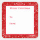 A festive Christmas holiday red and white snowflakes print is shown on this square gift tag peel and stick sticker.
