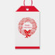 Holiday gift tag shown with a red and white festive wreath print. Coordinates with the holiday wrapping paper.
