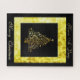 This ornate, graphic greeting card design, is of a Digitalized, scrolled, Christmas tree, in gilded gold, displayed upon a black, background, and framed in a simulated, embossed, pattern of gold-with Christmas Holiday greetings, in scripted gold, font.