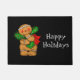 Holiday doormat shown with a black background with a cute gingerbread man happy holidays print.