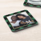 Rustic Christmas coaster features your customized photo and monogram in white type with a classic green plaid holiday pattern.