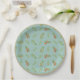 This paper plate features lots of Christmas greenery and berries on a blue background with a gold border.