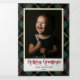 Modern custom decorative "Holiday Greetings" typography with editable colour (red used in preview) with gold-bordered photo template on classic elegant red, green and gold diagonal Christmas plaid with editable text fields. Panels feature complementary plaid background and additional photo and text templates.