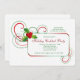 A beautiful invitation that's perfect for any holiday celebration. The white background features red and green swirls and a holly cluster at the corner of a rectangular message panel. Want to save money? Print this design on the basic, square corner paper.
