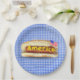 Hot dog on blue and white gingham for 4th of July or any other patriotic American holidays.