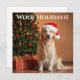 A delightful Christmas greeting card featuring a charming golden retriever in a Santa hat, radiating holiday cheer as it sits beside a dazzling Christmas tree adorned with ornaments and lights. The wrapped presents add a festive touch, creating a heartwarming and whimsical scene.