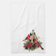 Holiday kitchen towel is shown in a lovely red cardinal bird print design.