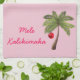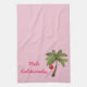 Kitchen towel shown in a festive holiday palm tree print. Mele Kalikimaka is Merry Christmas in Hawaiian in bright pink text, towel is Pinot Noir Pink.