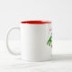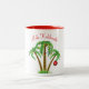 This coffee mug is shown with this cute green palm trees with a single ornament print. Greeting says "Mele Kalikimaka"