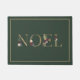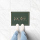 A holiday doormat in traditional style with modern accents, this forest green doormat features the letters NOEL spelled out in gold serif lettering embellished with burgundy, blue, and palest pink watercolor flowers and trailing greenery. A matching gold line border frames the text.