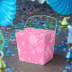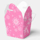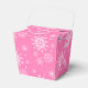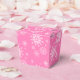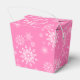 This holiday party favour box is shown in a festive Christmas holiday hot pink and white snowflakes print.