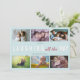 This personalized Christmas card also features a photo collage with 3 rows of 3 images, for a total of 9/nine pictures, and a falling snow/dots background (back).