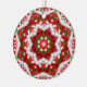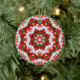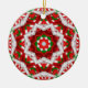 A red, white and green fractal art kaleidoscope decorates this Christmas tree ornament.