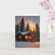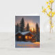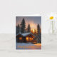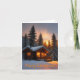 This holiday or Christmas card features a cozy cabin in the woods at sunset.