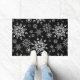 Holiday doormat is shown in a festive winter snowflakes print design.