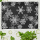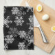 Kitchen towel is shown in a black colour with a holiday Christmas snowflakes print.
