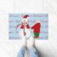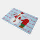 This holiday doormat is shown with a festive holiday Christmas snowman print on a blue background colour.