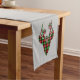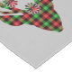 Holiday table runner is shown with a festive deer head print in a green and red plaid.