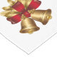Holiday table runner is shown with a festive gold bells print design.