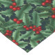 Holiday table runner is shown with a festive holiday holly print design.