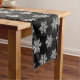 This holiday table runner is shown in a black colour with a festive Christmas snowflakes print.