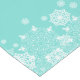 This Christmas holiday table runner is shown with a aqua blue background colour and has a festive Christmas white snowflakes print design.