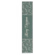 This simple Christmas table runner features a holiday winter greenery pattern appearing in soft tans and teals on a dark teal green background. The middle of the runner showcases the greeting "Merry Christmas" appearing in elegant script.