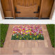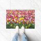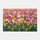 A field full of Dutch tulips. At the bottom of the picture spring the green stems of the first row of tulips, with the flowers on top. From there on, to the far, blurry background, just flowers... only tulip flowers in many colours. From yellow, to red, to purple, to pink. Typical sight in The Netherlands. On top of the green stems, the word Holland.
