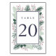 Wintry table number card features a midnight blue border with chic winter botanicals peeking out at the edges, including hunter green pine boughs, sage green leaves and bright red berries. Design repeats on reverse side. Coordinates with our Holly and Pine wedding invitation suite.