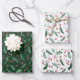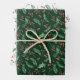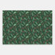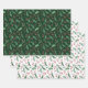 This pretty Christmas gift wrapping sheet set features a watercolor pattern of green holly leaves and red berries. Two sheets of the paper have the image printed on a white background, while the third sheet has the same image on a dark green background. Together, they make a nice contrasting gift package display.