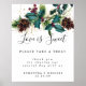Rustic winter holly and berry watercolor design. Holly and pine boughs are intertwined and decorated with berries and pinecones. Gold confetti is sprinkeled over the rustic greenery to give it a festive vibe. Love is Sweet is just below in a very trendy script font. Please take a treat is written in a classic serif font in all caps. The thank you sentiment is in small italics. The wedding couple's names and wedding date complete the text. It is all editable. You can even change the background if you wish.