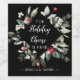 Thid design features leafy greenery frame with little bright red holly berry and hand lettered text Holiday Cheers on the elegant black background.