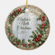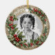 A vintage style holly frame for your custom photo, with custom commemorative text on the other side, on this round ceramic Christmas tree ornament.