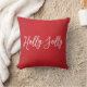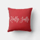 Red Christmas throw pillows with white Holly Jolly text and decoration. Pillows are made of polyester and measure 16 inches by 16 inches, but other dimensions are available too as well as cotton covers.