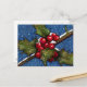 My illustration of a clump of holly leaves with bright red berries; snow falls against a deep blue background.
