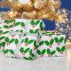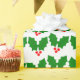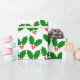 This wrapping paper has a Christmas design of holly leaves and berries scattered about on a field of white.