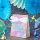 Soft holo-esque glow of pink, aqua and goldenrod layered geometric shapes. A very orderly pile of glitter.