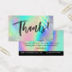 Thank you for your purchase customer discount card package insert in a relaxed casual and flirty font with a fantasy rainbow galaxy background. Fully customize the text and social media icons for your brand. Thank your clients and customers for shopping with you by including this with your packages and products to say Thanks and to give them a coupon code for a future purchase to encourage repeat business and to find you on social media. You can add or remove social media icons (Twitter, Instagram, TikTok, Pinterest, Snapchat, Youtube, Facebook, etc) by choosing "customize further" and turning them on/off in the layers panel and you can edit the colours too!